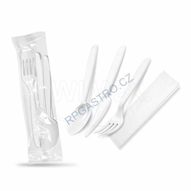 Hygienicky balené bílé plastové příbory v sadě: nůž (PP/18,5 cm/1 ks) + vidlička (PP/18,5 cm/1 ks)+ lžíce(PP/18,5 cm/ 1 ks) + ubrousek (PAP-100% celulóza 1 ks).