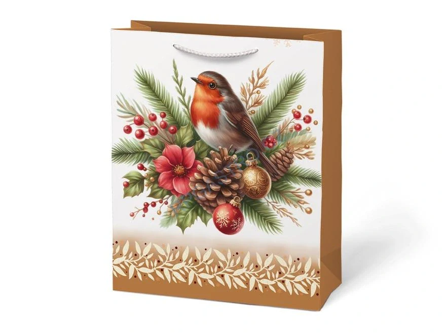 Vánoční dárková papírová taška T5 s vánočními motivy je dokonalým spojením elegance a praktičnosti. Taška je vhodná na balení všech druhů dárků, od malých překvapení po větší předměty, a přidává jim kouzlo sváteční atmosféry. Je skutečně nepostradatelným pomocníkem, když se balení dárku do klasického balicího papíru zdá být příliš obtížné. Její robustní ucha zajišťují pohodlné a bezpečné přenášení.