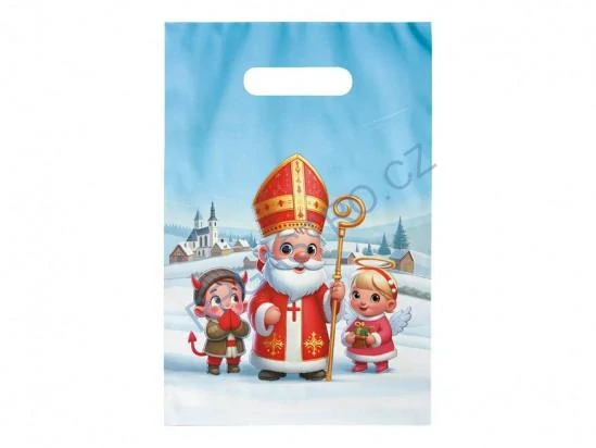 Igelitová taška s průhmatem v Mikulášském motivu. Na tašce je obrázek Mikuláše, anděla a čerta. Ideální na zabalení dobrot, sladkostí a na další mikulášskou nadílku pro děti.